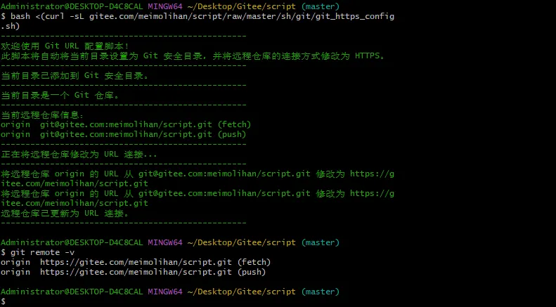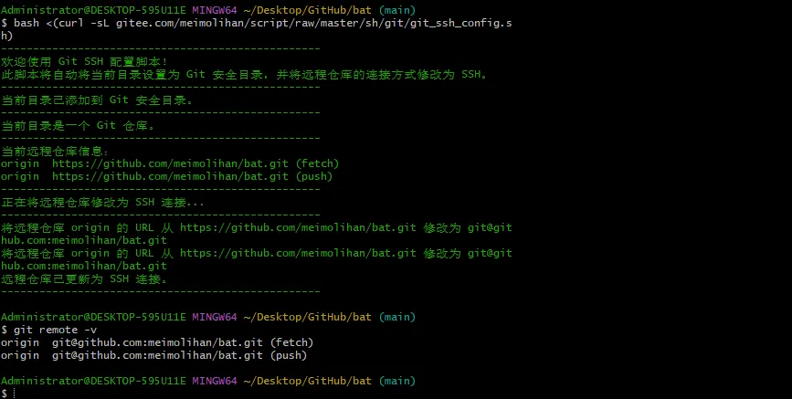 通过使用这些脚本,你可以轻松在 SSH 和 HTTPS 协议之间切换 Git 远程仓库连接方式。SSH 提供更安全和高效的连接,而 HTTPS 则更通用和易于设置。根据你的网络环境和工作流程选择最适合的连接方式。