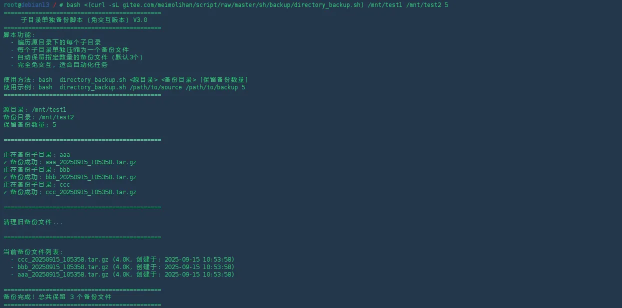 bash <(curl -sL gitee.com/meimolihan/script/raw/master/sh/backup/directory_backup.sh) /mnt/test1 /mnt/test2/ 5
