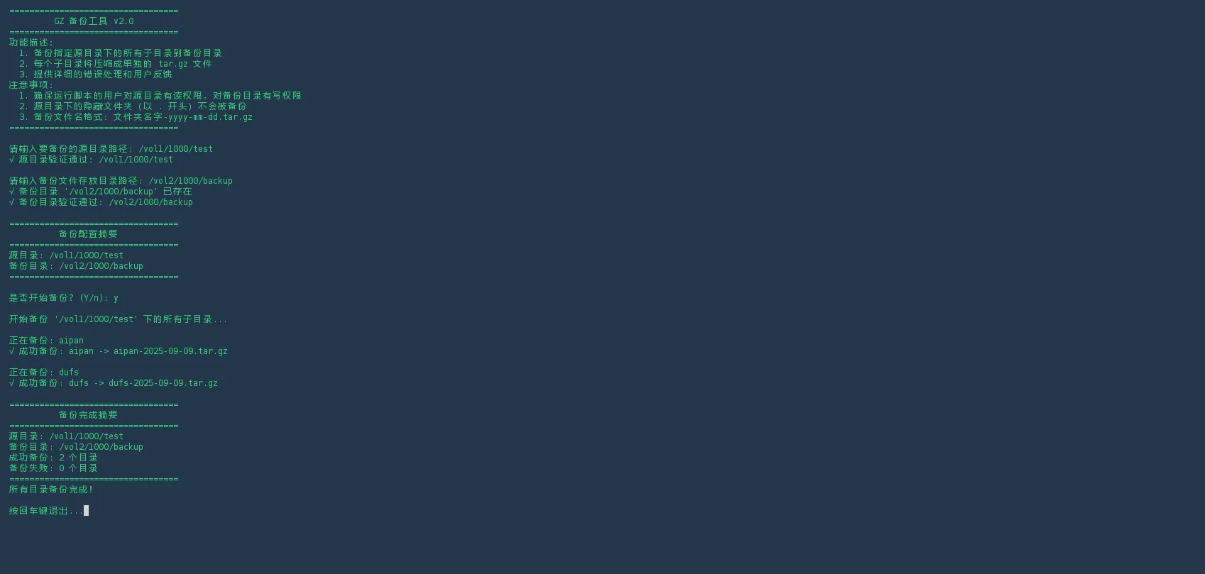 此功能用于遍历当前目录下的所有子目录,并将每个子目录压缩为一个同名的 .tar.gz